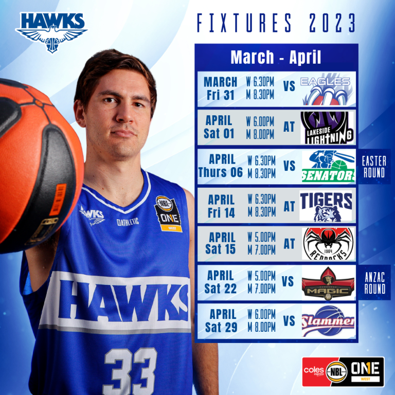 Hawks NBL1 West Fixtures are out View all sponsors Become a sponsor Related Posts 27/08/2024 WABL Finals Week 1 Wrap Read more 02/08/2024 NBL1 West Women through to Preliminary Final Saturday Night against Cockburn Read more 31/07/2024 Parking at Bendat on Thursday and Friday Read more 27/07/2024 Hawks Women into the Semi-Final Thursday Night at Bendat Read more