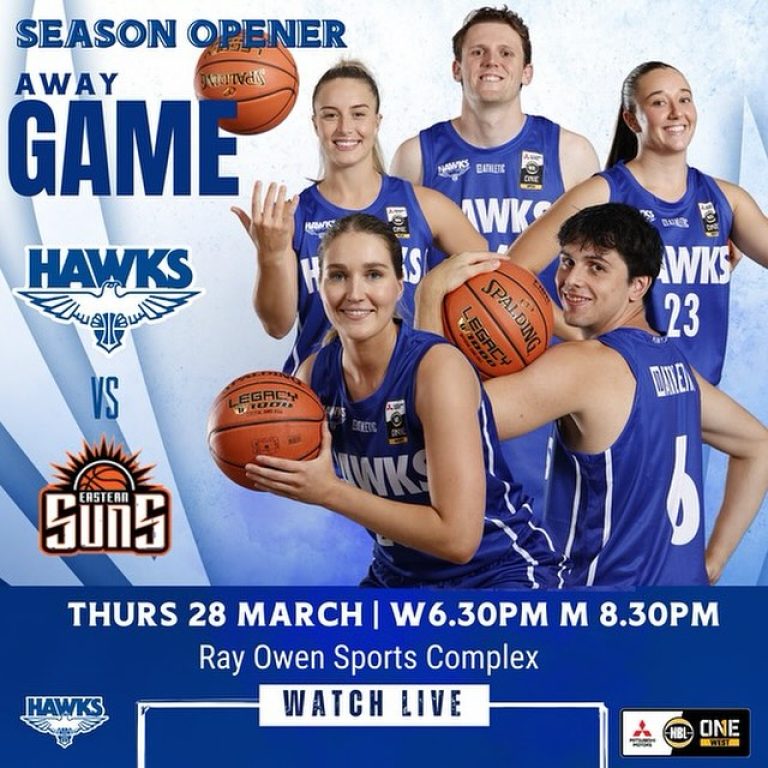 NBL1 West Opening Game Thursday Night It’s 2 days until the opening round of NBL1 West. The Hawks head to Kalamunda Thursday night to take on the Eastern Suns Thursday March 28th Ray Owen Sports Complex Kalamunda Eastern Suns Women Tip-Off 6:30pm Men Tip-Off 8:30pm Tickets available at the door Watch it live and free on the NBL1 app Let’s Go Hawkies! View all sponsors Become a sponsor Related Posts 27/08/2024 WABL Finals Week 1 Wrap Read more 02/08/2024 NBL1 West Women through to Preliminary Final Saturday Night against Cockburn Read more 31/07/2024 Parking at Bendat on Thursday and Friday Read more 27/07/2024 Hawks Women into the Semi-Final Thursday Night at Bendat Read more