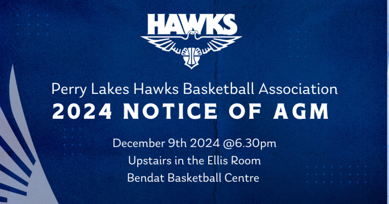 Notice is hereby given of the Annual General Meeting of the Perry Lakes Hawks Basketball Association (Inc) to be held MONDAY 9th December 2024 at 6.30pm in the Ellis Room at Bendat Basketball Centre.
