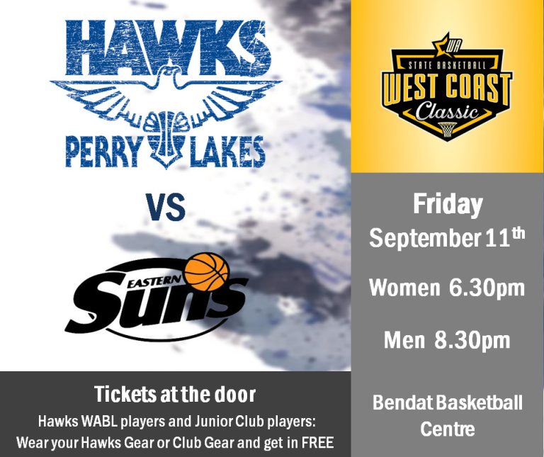 The Hawks will take on the Kalamunda Eastern Suns this Friday night in what will be their last regular season home game. With one round to go the action is heating up as teams must finish in the top 4 to play finals in the West Coast Classic. The men currently sit in 2nd position with 9 wins and 2 losses whilst the Lady Hawks sit just outside the 4 in 6th position with 6 wins and 3 losses.